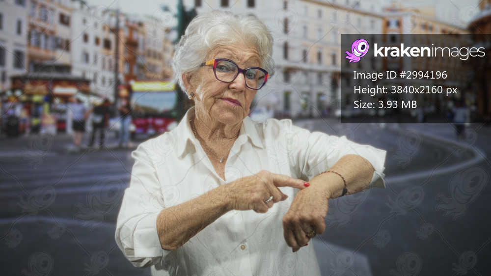 Elderly woman in white shirt and multicolored glasses points finger to wrist on busy city street with historic buildings and tram; impatience time.