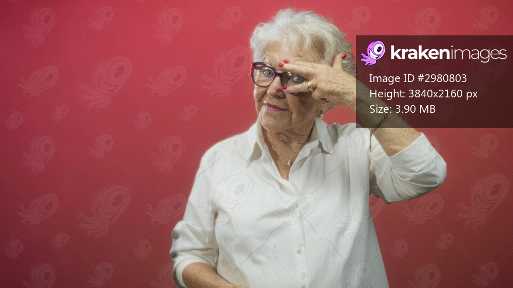 Elderly woman peeking through fingers with hand covering eyes, wearing glasses and white shirt against red studio wall; playful.
