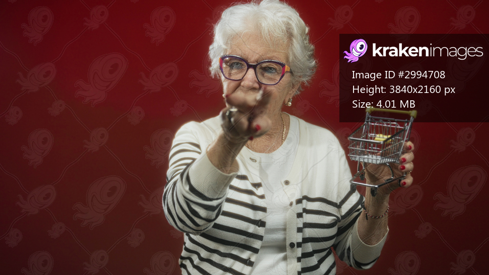 Elderly woman pinches nose while holding miniature shopping cart in studio with red backdrop; disgust.