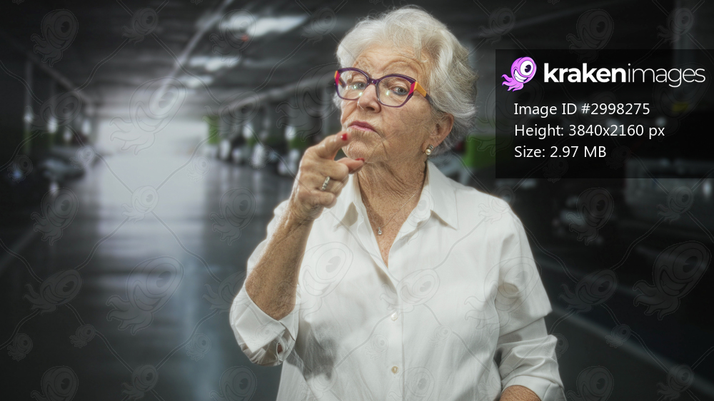 Elderly woman points finger at camera in parking garage building, wearing colorful glasses and white blouse; warning authority.
