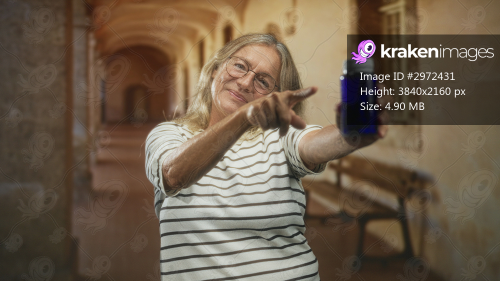 Elderly woman points with finger and holds a blue pill bottle in a nursing home building corridor, smiling in striped shirt; comfort care.