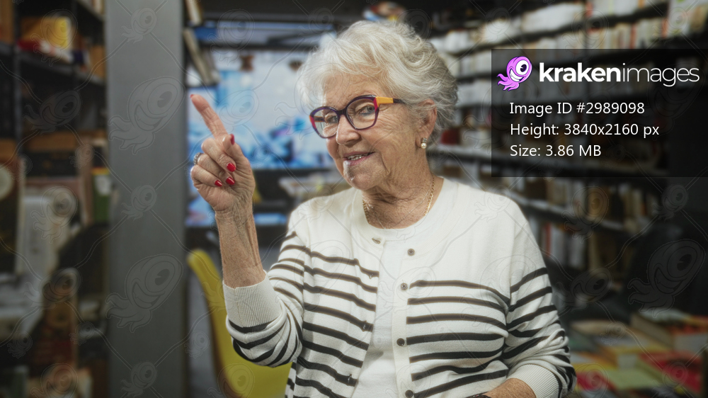 Elderly woman points finger to bookshelf in building, colorful glasses and red nails visible; gentle warmth.