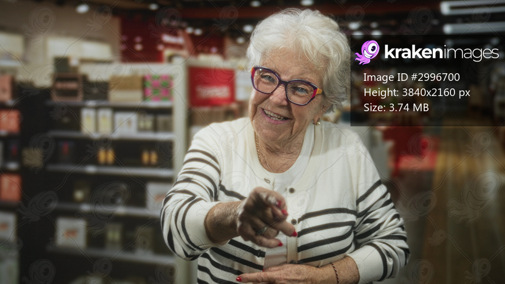 Elderly woman points finger to camera inside a department store building, smiling, wearing purple glasses and striped cardigan, shelves of products visible; joy. - Kraken Images