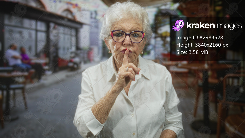 Elderly woman presses finger to lips in a shushing gesture at a street cafe, wearing colorful glasses, white blouse, necklace and red nails; silence.