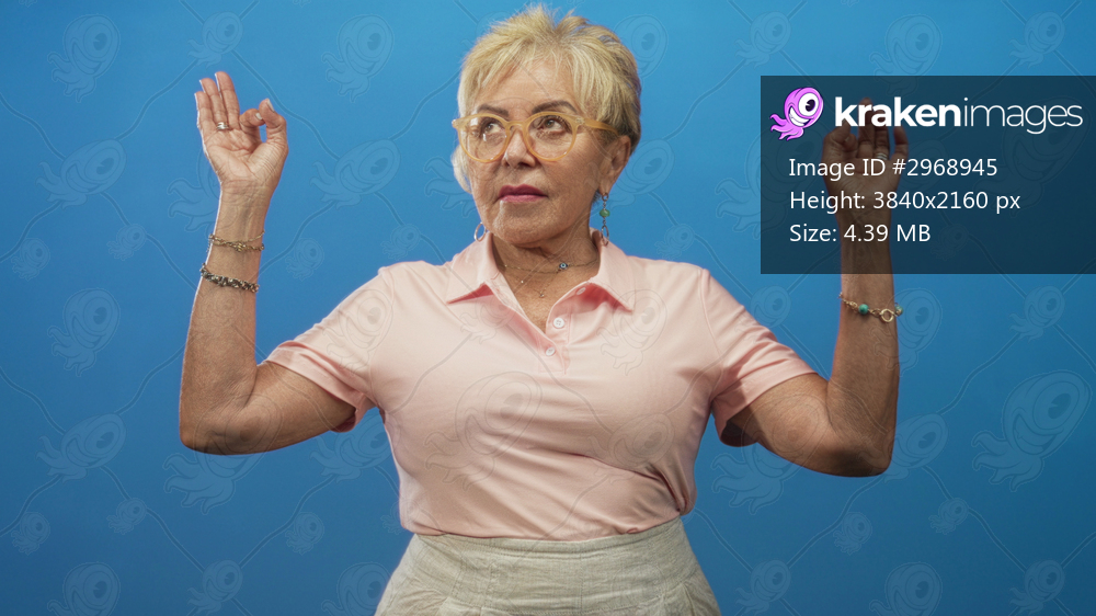 Elderly woman with raised hands making ok sign in a studio setting wearing pink polo and jewelry; mindfulness confidence.