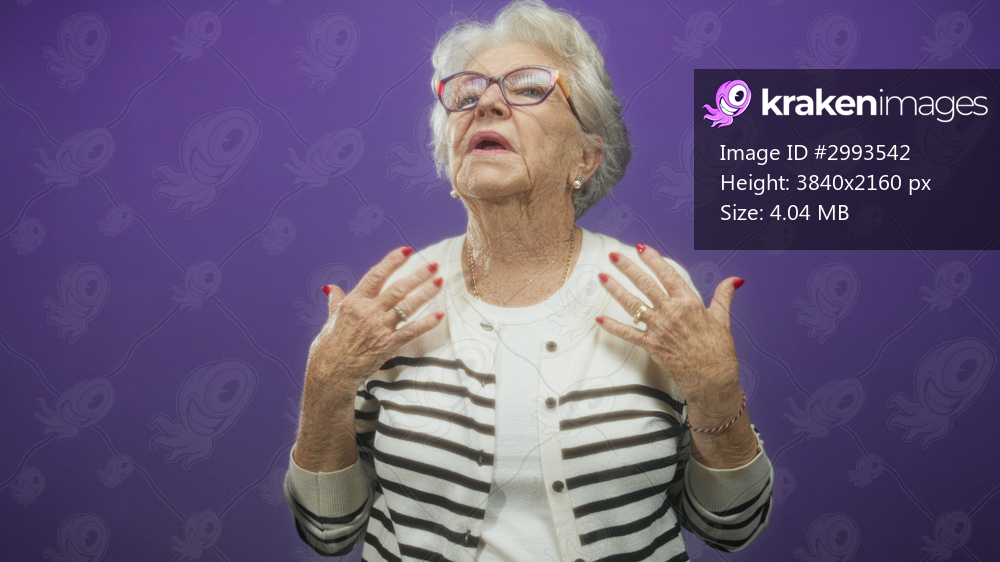 Elderly woman raising hands with palms up and painted nails in a purple studio wearing glasses and striped cardigan; calm reflection.