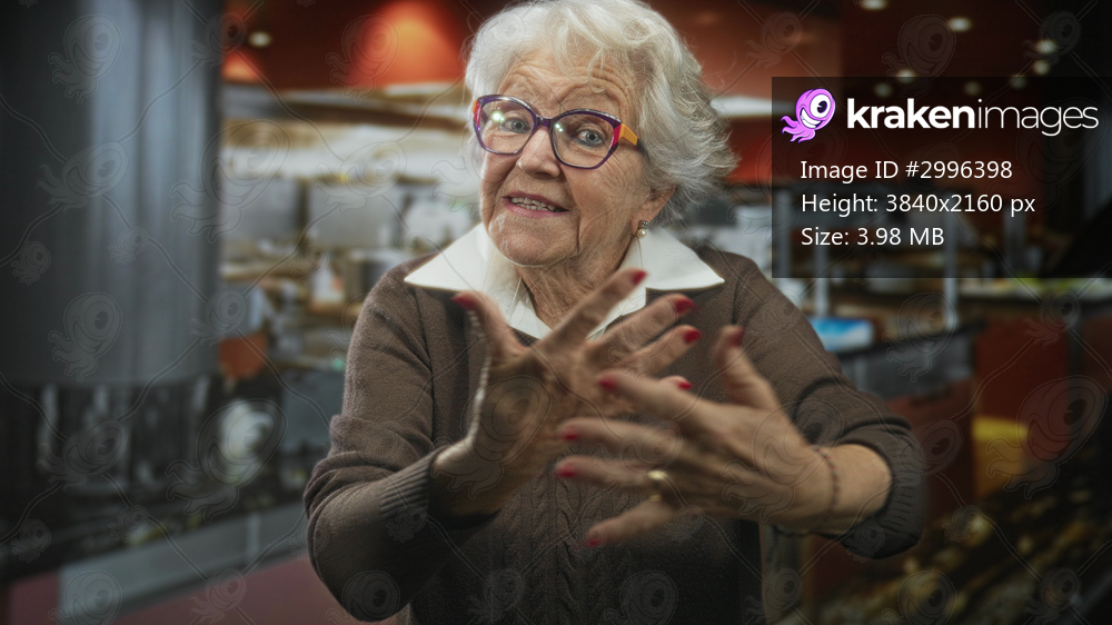 Elderly woman with red nails and rings crosses hands over chest in a cafeteria serving line by a kitchen counter, wearing glasses and brown sweater; gentle gratitude. - Kraken Images