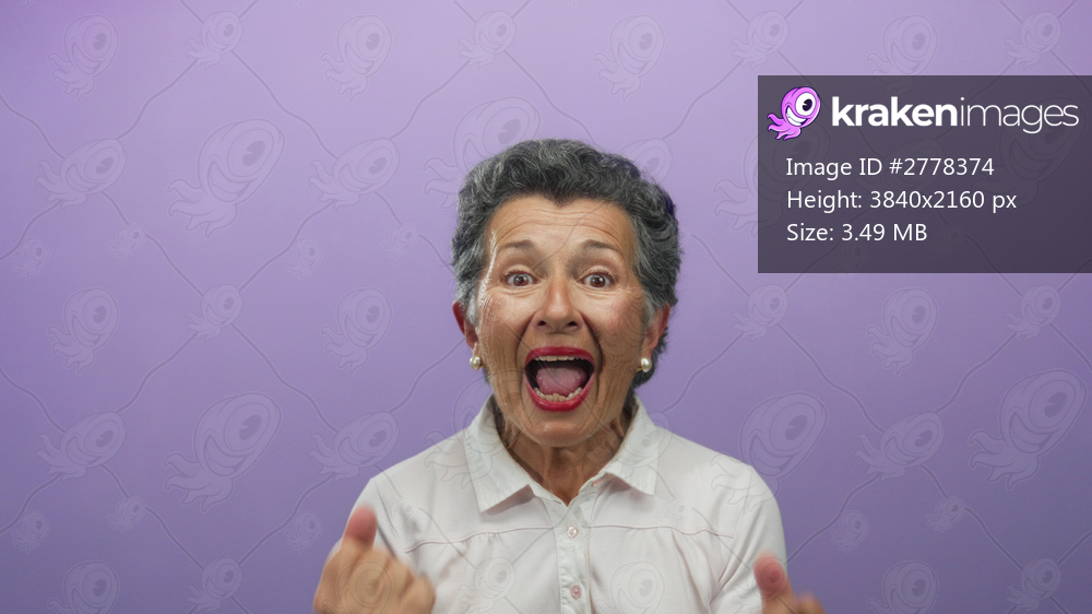Elderly woman with short grey hair expresses emotion with clenched fists against a vibrant purple background, wearing a white shirt and showing determination and joy. - Kraken Images