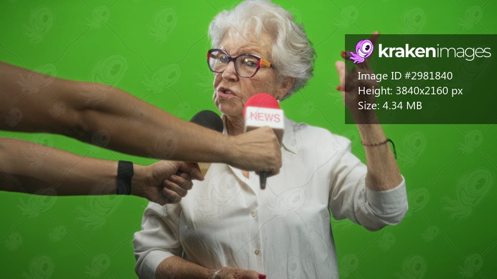 Elderly woman speaks into a news microphone during interview in studio in front of green screen; concern testimony.