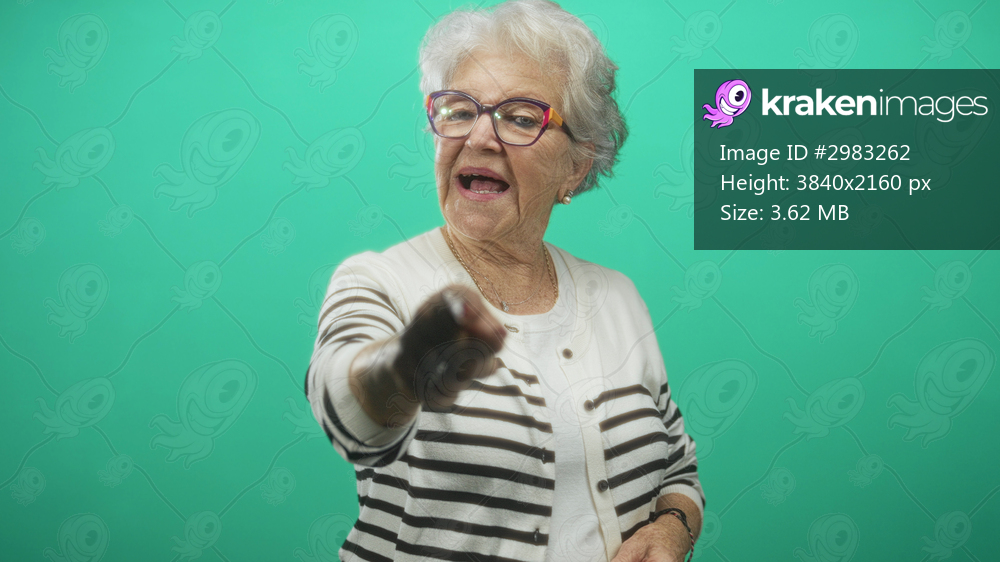 Elderly woman with striped cardigan and colorful glasses points finger to camera in studio, smiling and engaging; joyful confidence.