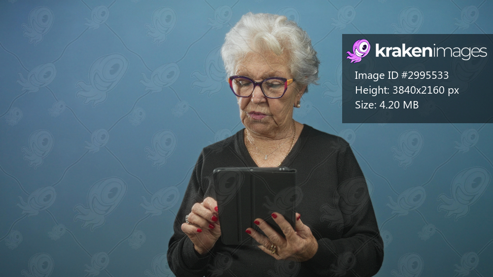 Elderly woman tapping a tablet with hands, wearing glasses and red nails, in a blue studio with plain backdrop and black sweater; focused concentration learning. - Kraken Images