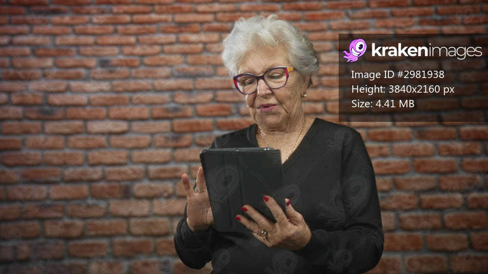 Elderly woman tapping a tablet with visible hands and red nails, wearing colorful glasses and a black sweater, standing in a studio brick wall; digital curiosity independence. - Kraken Images