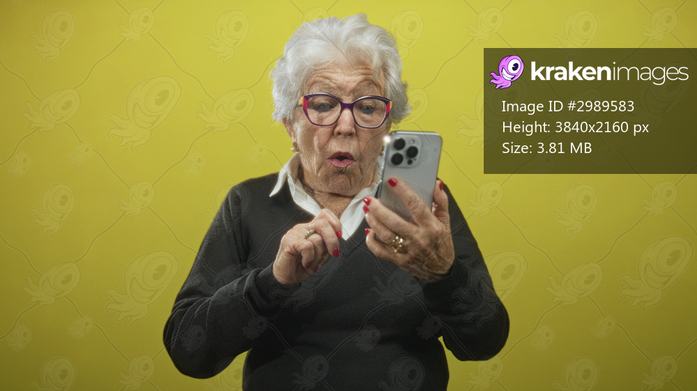 Elderly woman tapping smartphone with both hands, red nails visible, wearing purple glasses and black sweater against yellow studio backdrop; curiosity learning technology. - Kraken Images