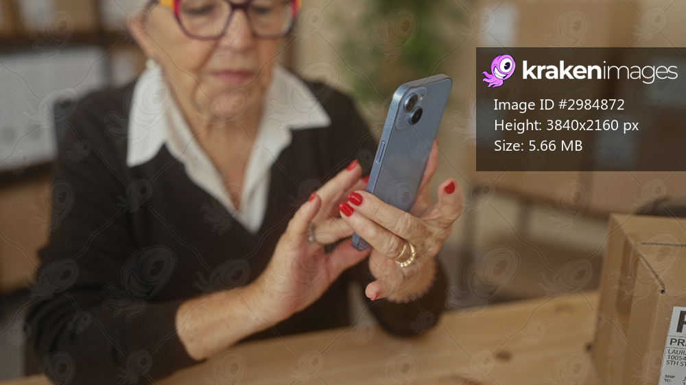 Elderly woman taps smartphone with red nails holding package near shipping boxes in a building; small business determination.