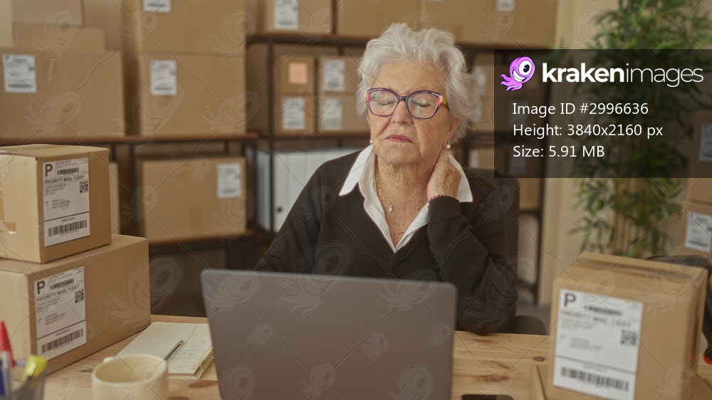 Elderly woman touches neck while sitting at packing table with laptop and stacked shipping boxes in small business building; tiredness resilience.
