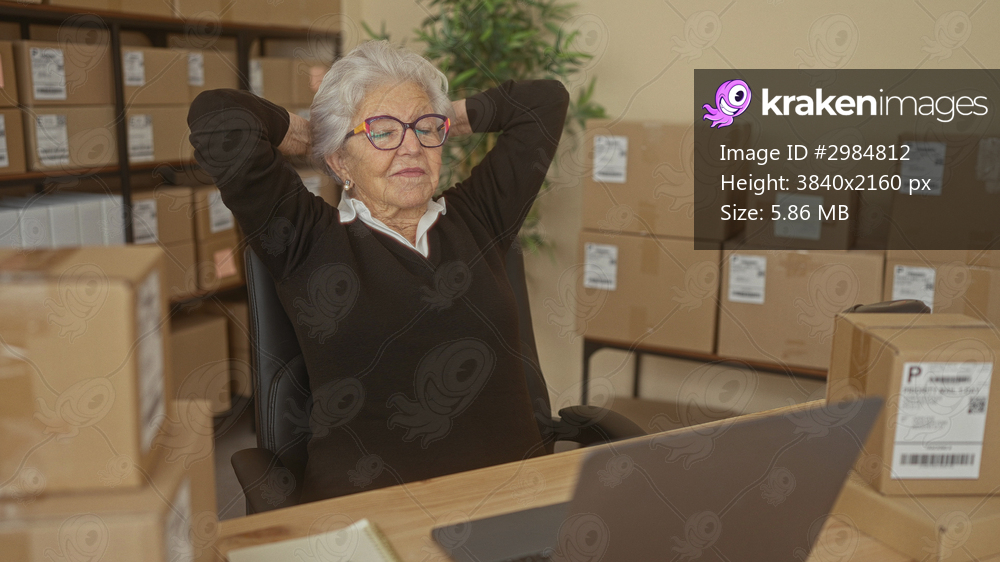 Elderly woman typing on laptop and tapping smartphone among stacked shipping boxes and labels in a fulfillment building; small business pride.