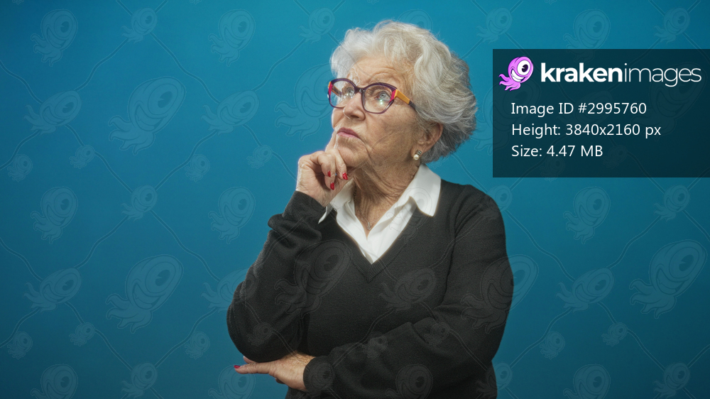 Elderly woman wearing glasses and a collared shirt with sweater, hand on chin and folded arm, looking upward against blue studio backdrop; pensive reflection. - Kraken Images