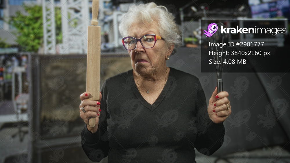Elderly woman wearing glasses and black sweater holds rolling pin and whisk with raised hands in studio set, red nails visible; determination.