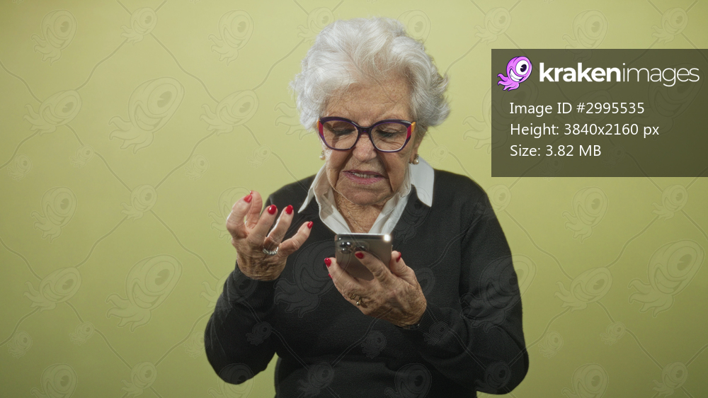 Elderly woman wearing glasses and black sweater holds smartphone and gestures at painted fingernails while frowning in studio; frustration learning patience. - Kraken Images