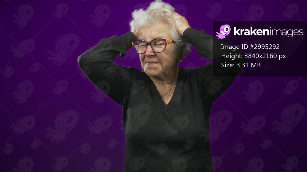 Elderly woman wearing glasses and black sweater pressing hands to head in a purple studio; stress fatigue.