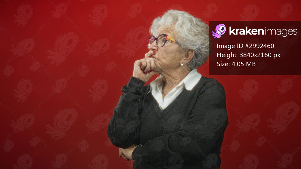 Elderly woman wearing glasses with hand on chin and folded arms in a red studio, white collared shirt and black sweater; thoughtful reflection.