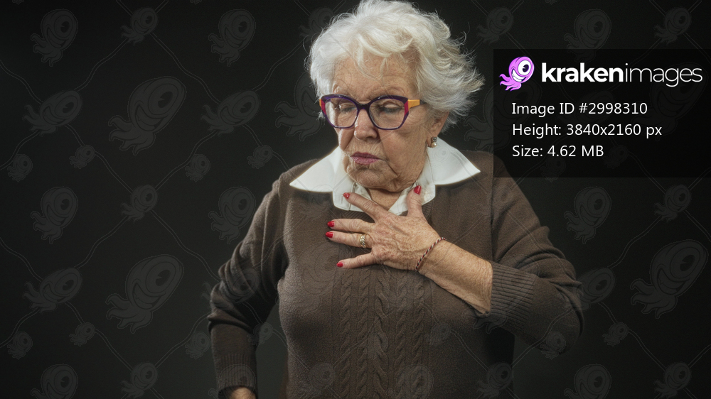 Elderly woman with white hair and colorful glasses, hand on chest and pursed lips, red nails and ring, brown sweater with white collar in studio; concern vulnerability. - Kraken Images