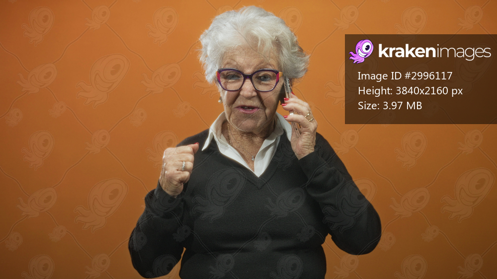 Elderly woman with white hair and glasses holding smartphone, looking at screen and making a celebratory fist pump gesture in studio; joy connection.