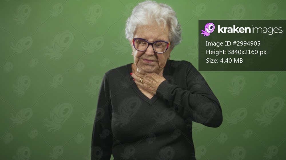 Elderly woman with white hair and glasses holds her throat with hand in studio against green backdrop, appearing to cough or choke; discomfort.