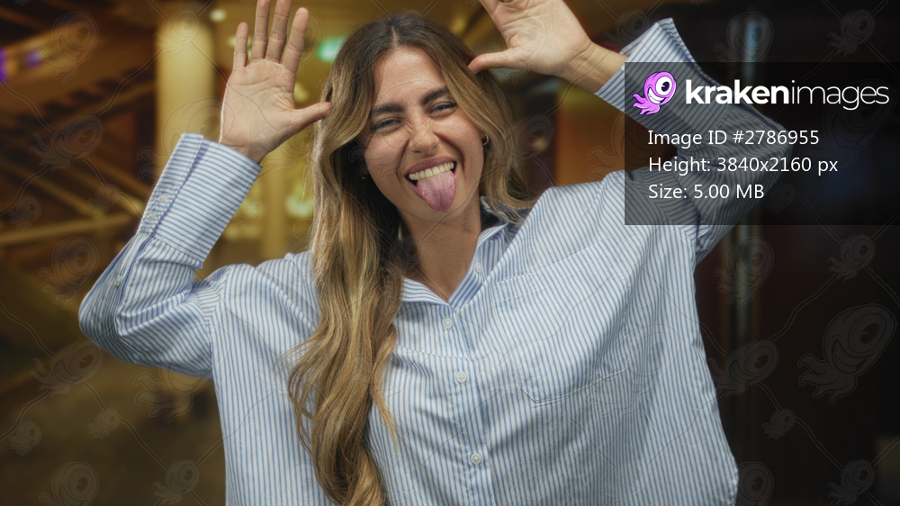Elegant blonde woman spreads arms open with a bright smile and tilts head in a hotel lobby adorned with brass pillars and warm overhead lights; playfulness joy. - Kraken Images