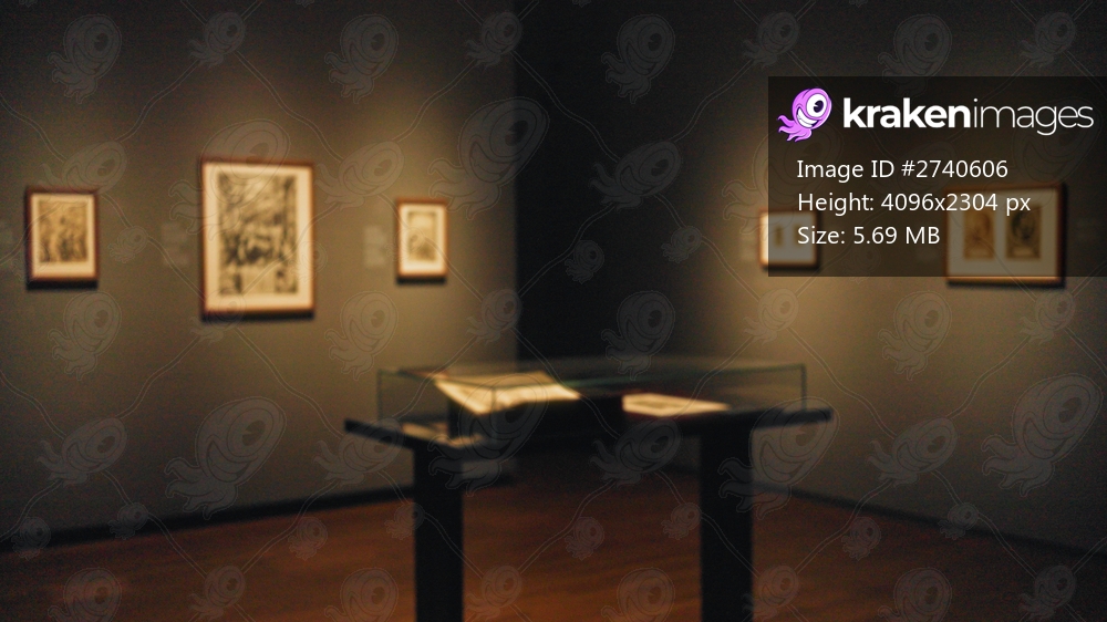 Empty art gallery room with blurred paintings on dimly lit walls, showcasing a serene and focused atmosphere with an elegant display case in the foreground. - Kraken Images