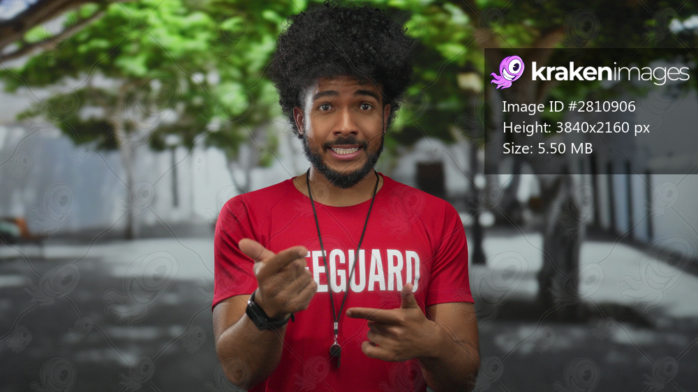 Energetic lifeguard man outdoors in city street gesturing happily in a vibrant setting with lush greenery and urban background.