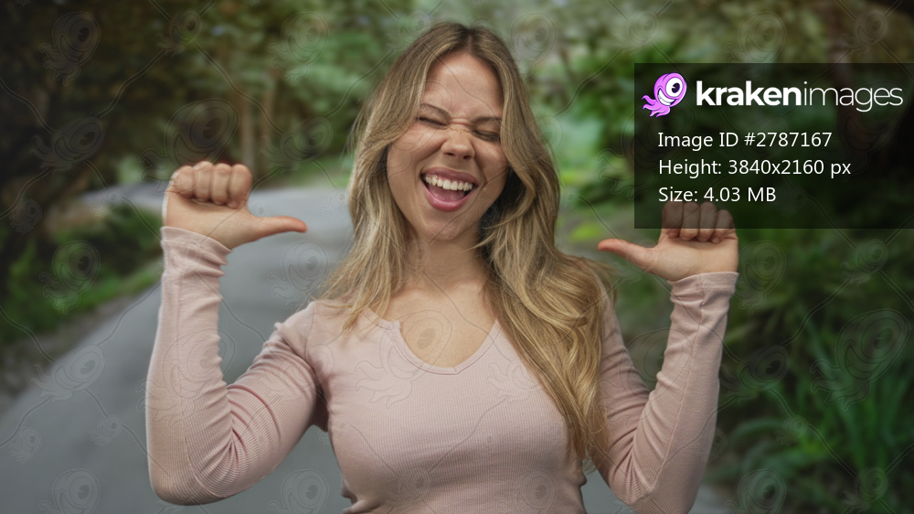 Energetic young blonde woman points thumbs to chest in a park; confidence pride empowerment determination.
