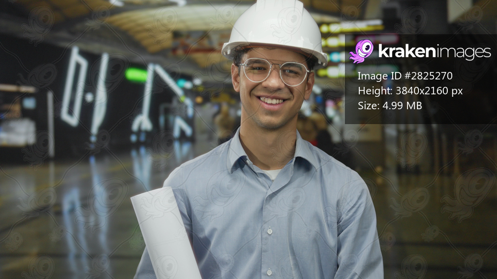 Engineer holding rolled blueprint smiling and wearing hardhat at modern airport terminal arrival hall; pride.