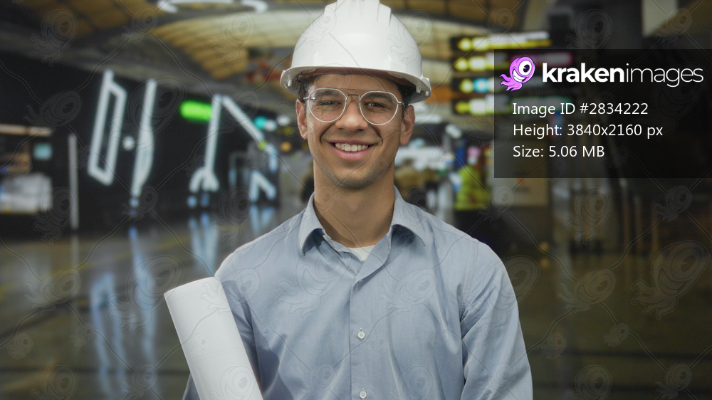 Engineer holding rolled blueprint smiling and wearing hardhat at modern airport terminal arrival hall; pride.