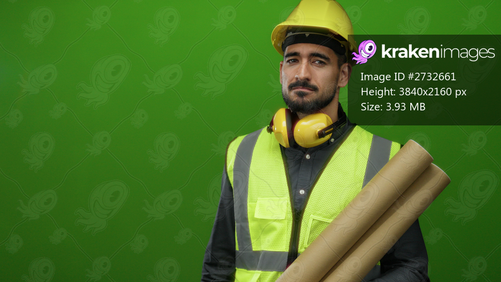Engineer man in a safety vest and helmet holding blueprints against a green background, showcasing construction professionalism.