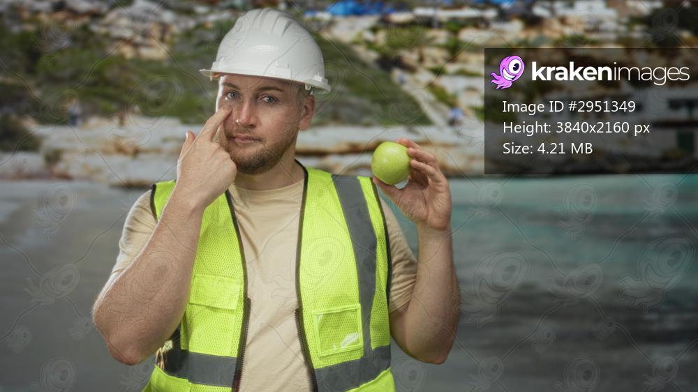 Engineer man wearing hardhat and high visibility vest holds green apple and points finger to cheek in studio; safety reminder playful.