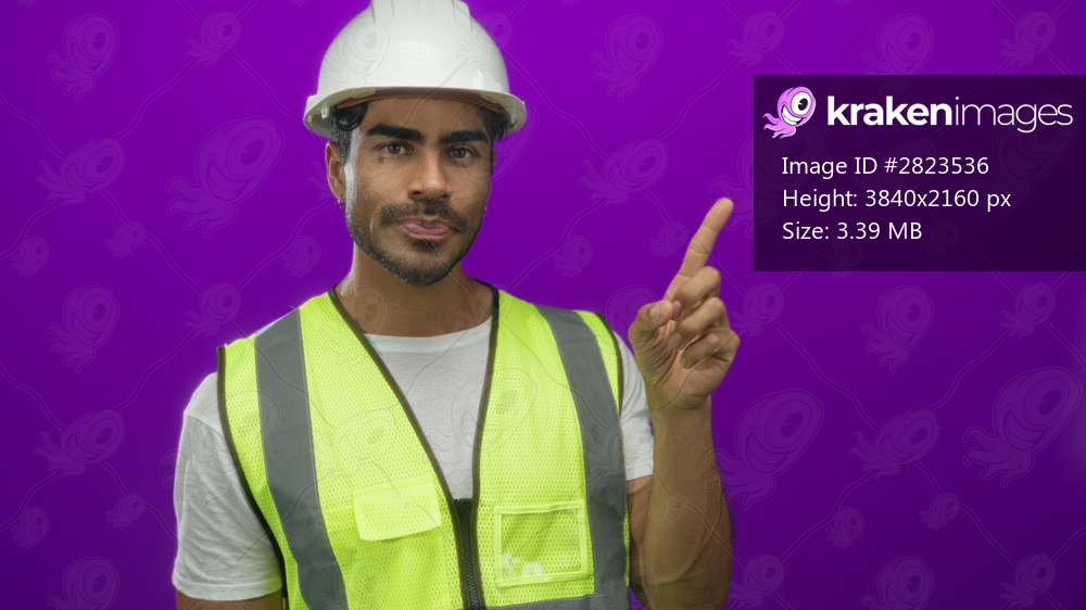 Engineer man wearing white hardhat and fluorescent vest points finger to object against vivid purple studio wall; precision focus.