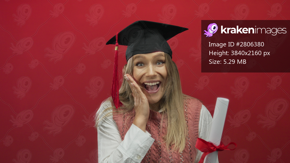 Enthusiastic woman in graduation cap celebrates success holding diploma against vibrant red background