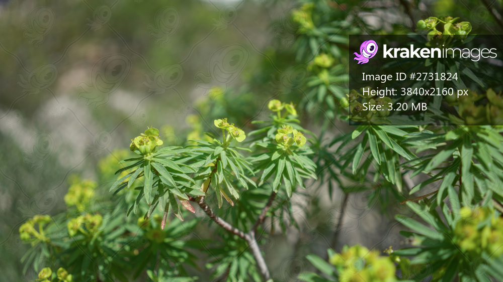 Euphorbia characias plant with bright green leaves and yellow flowers in outdoor sunlight in mallorca, spain, showcasing mediterranean vegetation in a natural setting. - Kraken Images