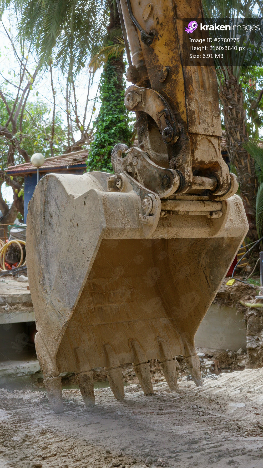 Excavator bucket in action outdoors under a sunny sky surrounded by greenery and construction environment highlighting machinery and construction equipment. - Kraken Images