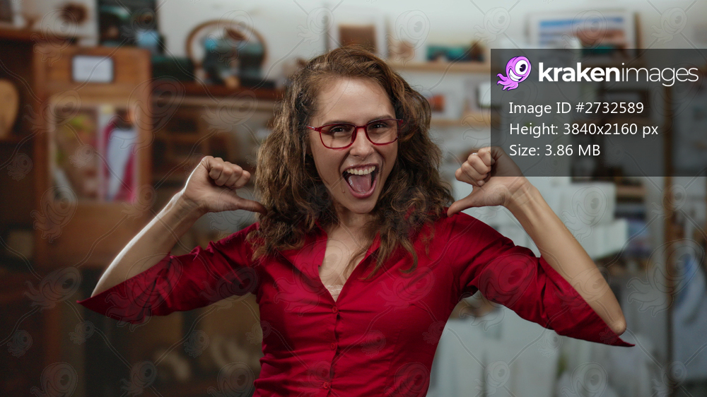 Excited woman with glasses in a red shirt pointing thumbs at herself indoors, showcasing self-confidence and energy in a vibrant hotel setting.