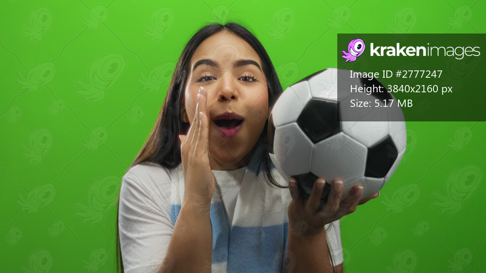 Excited young woman holding soccer ball celebrating indoors in front of a vibrant green background with expressive smiling face, conveying joy and enthusiasm for the sport. - Kraken Images
