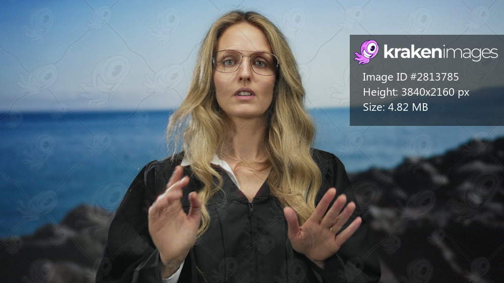 Expert woman raises her hand while gesturing across a windy beach with a young blonde judge in uniform near a calm seaside outdoors.
