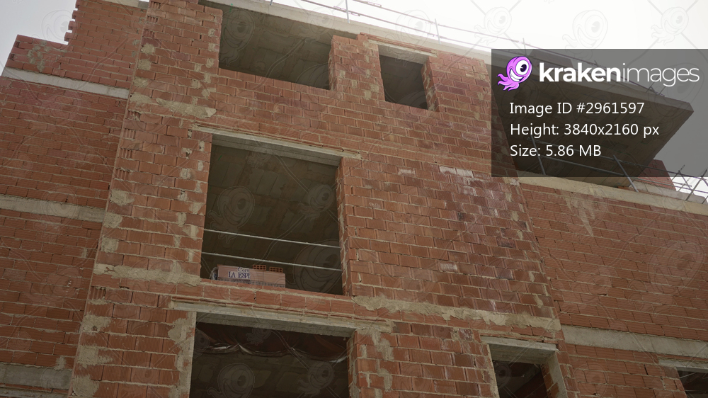 Facade with open window, stacked bricks and metal scaffolding showing active construction on a building site; unfinished development.