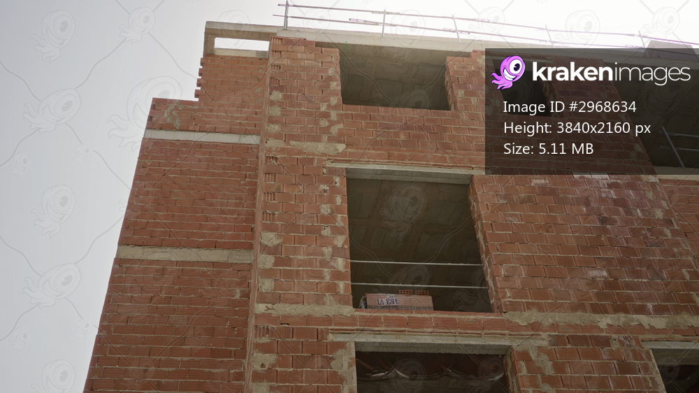 Facade with open window, stacked bricks and metal scaffolding showing active construction on a building site; unfinished development.