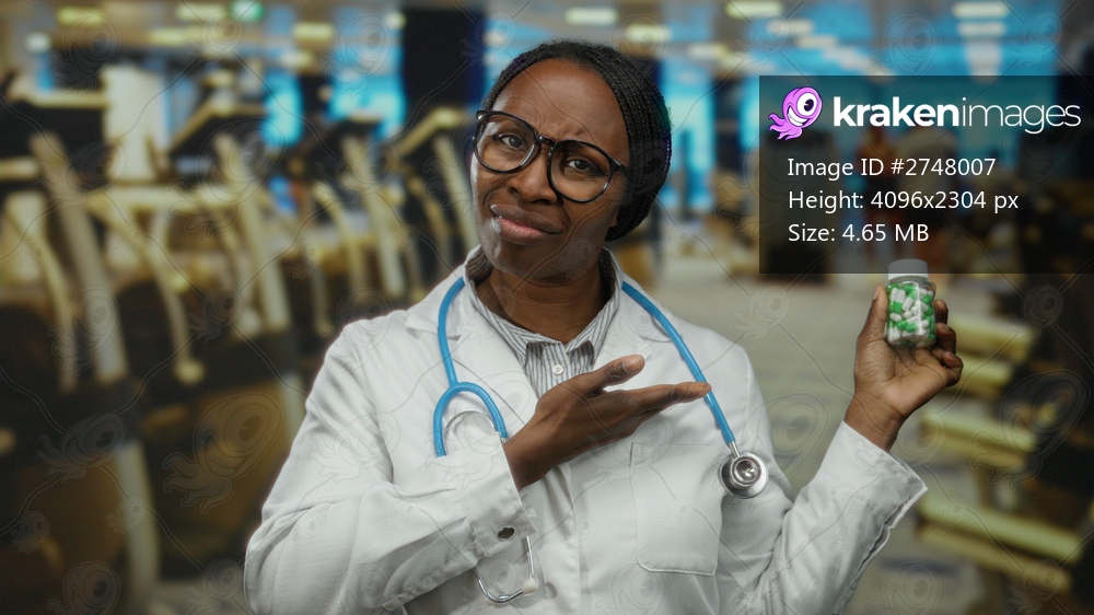 Female doctor with a stethoscope holds a medication bottle in a gym, looking skeptically at the viewer, highlighting health choices and lifestyle in a medical context. - Kraken Images