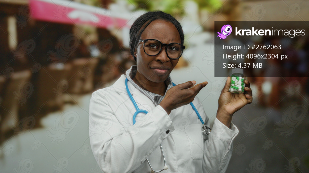 Female doctor with glasses holding medicine bottle on urban street puzzled expression suggesting outdoor healthcare setting.