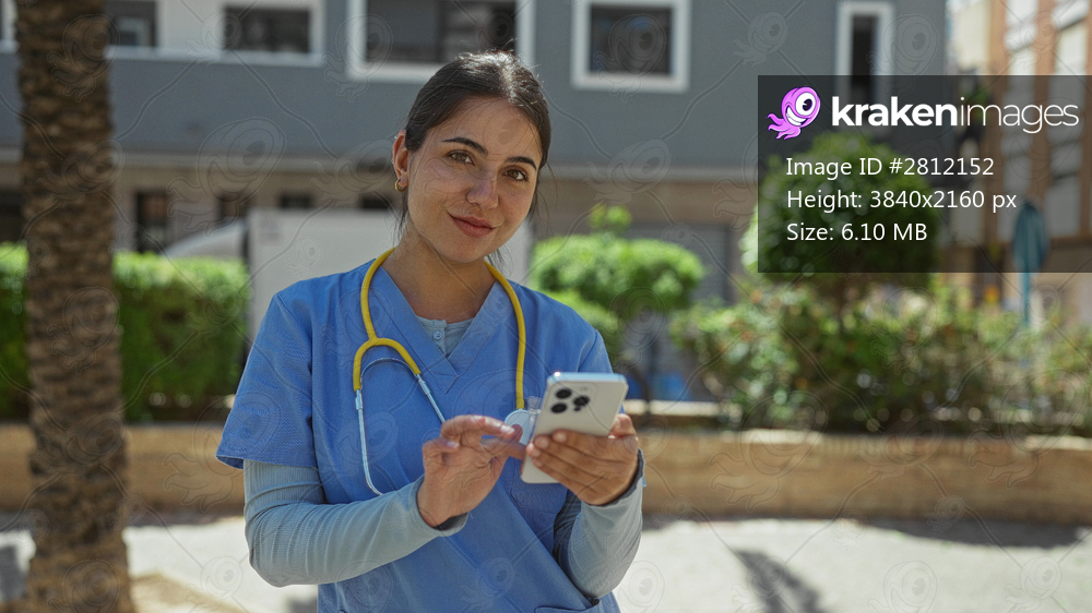 Female doctor in blue uniform with stethoscope using smartphone outdoors in a sunlit park setting surrounded by greenery and buildings showcasing user engagement and connectivity. - Kraken Images