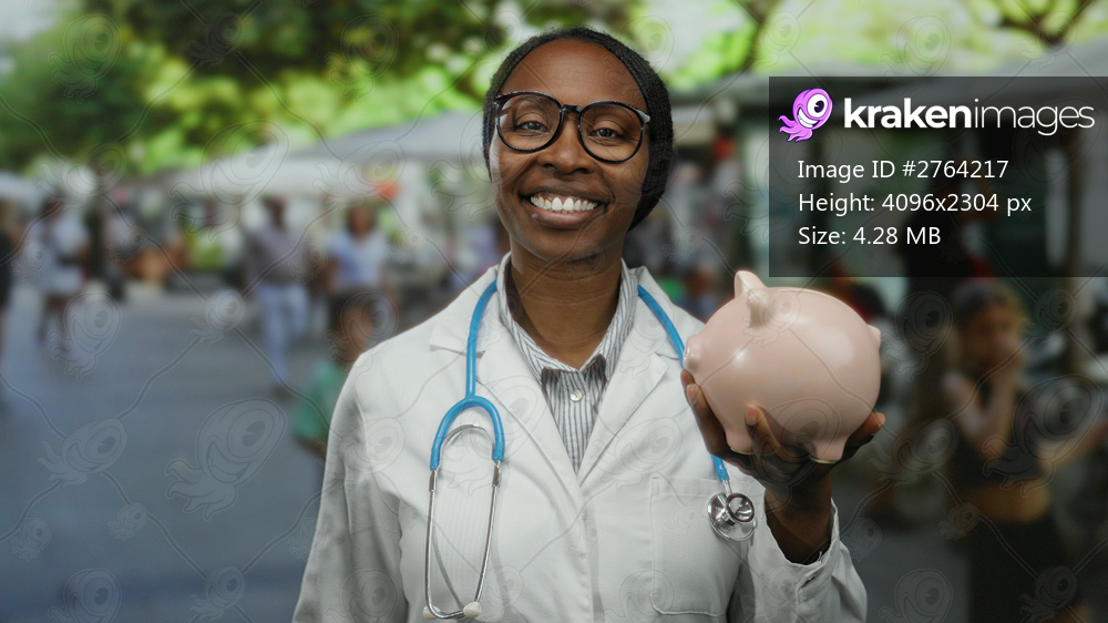 Female doctor smiling holding piggy bank on urban street showcasing financial health with people in background under sunny skies and trees representing wellbeing and savings - Kraken Images