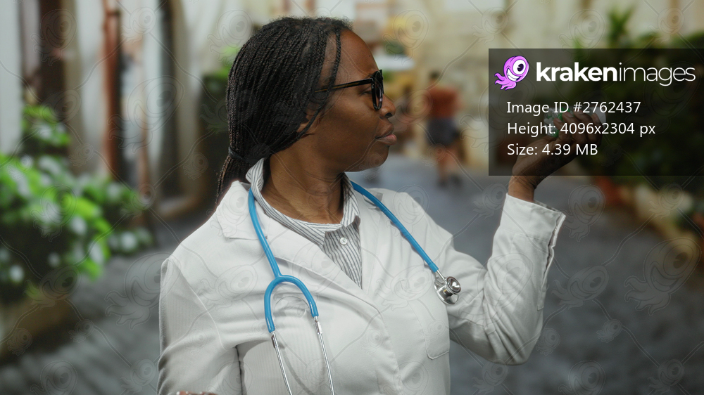 Female doctor with stethoscope holding bottle of pills on urban street examining medication outdoors with greenery blurred in background.